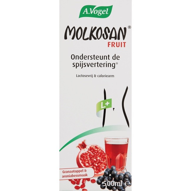 A. Vogel Molkosan Fruit 200 ml ondersteunt de spijsvertering, doordat het een bron van Calcium is. Dit voedingssupplement bevat 100% natuurlijke melkwei met granaatappel, aroniabes en stevia. Een goede spijsvertering is van belang voor onze gezondheid. Als de spijsvertering goed functioneert, voelen we ons fit en vitaal. Lekker door de yoghurt, havermout-pap of als dressing in de salade!