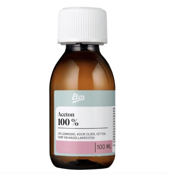Aceton is een oplosmiddel dat je kunt gebruiken voor het verwijderen van olie- en vetvlekken in kleding en op meterialen. Niet gebruiken op tere weefsels. Test het voor gebruik eerst op een klein stukje van het materiaal.