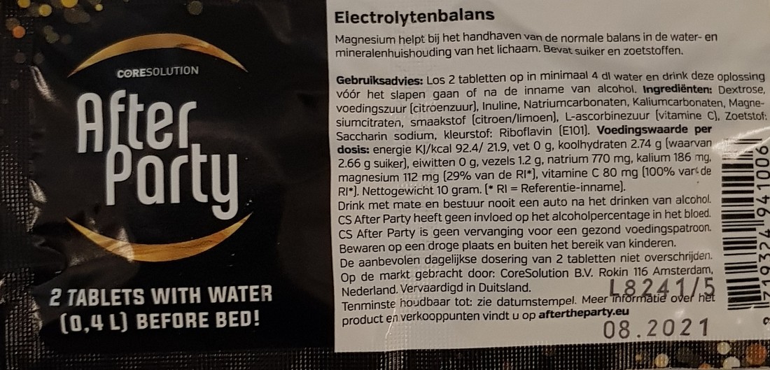 Diverse electrolyten die uitdrogings verschijnselen helpt voorkomen. Na het nuttigen van alcohol in nemen voor het slapen gaan.