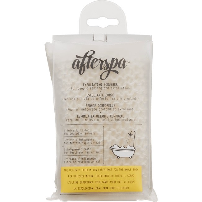AfterSpa Bath And Shower Exfoliating Scrubber: 1. Exfolierende lichaamsscrubber 2. Verwijderd dode huidcellen op milde wijze 3. Polyurethane spons 4. Diepe reiniging van de huid voor een spoele en stralende huid"