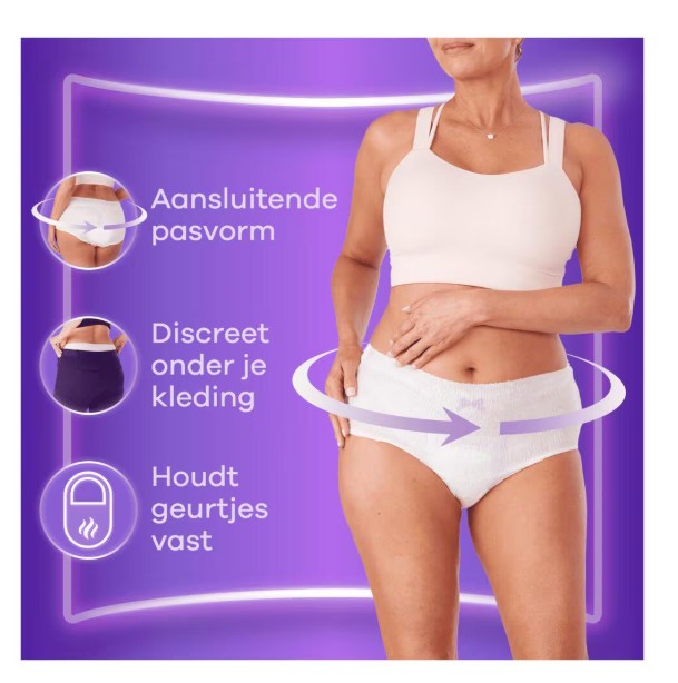 - Broekje met hoge taille dat mooi op je lichaam aansluit. Ideaal voor veel urineverlies gelijk aan de hoeveelheid van een volle blaas