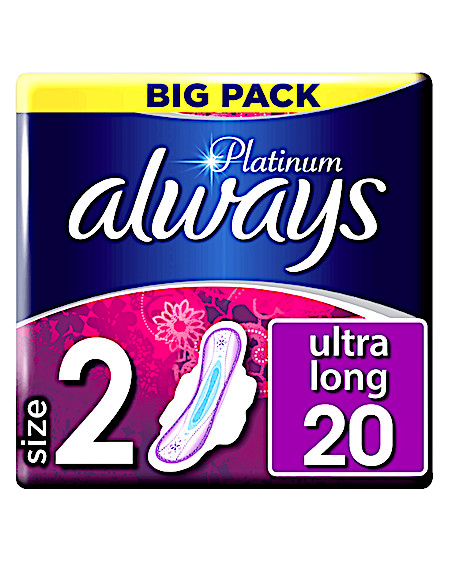 Always Platinum Ultra Long (Maat 2) Maandverband Met Vleugels big pack is het beste maandverband in het Always Ultra assortiment. Het biedt optimaal comfort en bescherming, dankzij de unieke dubbele bovenlaag met micro-kussentjes. De 1000 micro-kussentjes bieden meer zachtheid en comfort (in vergelijking met Always Ultra). Het maandverband ideaal voor een lichte menstruatie met lingeriemaat L, voor een gemiddelde menstruatie met lingeriemaat M en L, of voor een zware menstruatie met lingeriemaat S. Het N°1 maandverband in comfort en bescherming (in het Always Ultra assortiment).