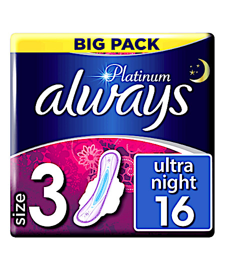 Always Platinum Ultra Night (Maat 3) Maandverband Met Vleugels big pack is het beste maandverband in het Always Ultra assortiment. Het biedt optimaal comfort en bescherming, dankzij de unieke dubbele bovenlaag met micro-kussentjes. De 1000 micro-kussentjes bieden meer zachtheid en comfort (in vergelijking met Always Ultra). Het maandverband is ideaal voor een gemiddelde menstruatie met lingeriemaat L of voor een zware menstruatie met lingeriemaat M en L. Het N°1 maandverband in comfort en bescherming (in het Always Ultra assortiment).