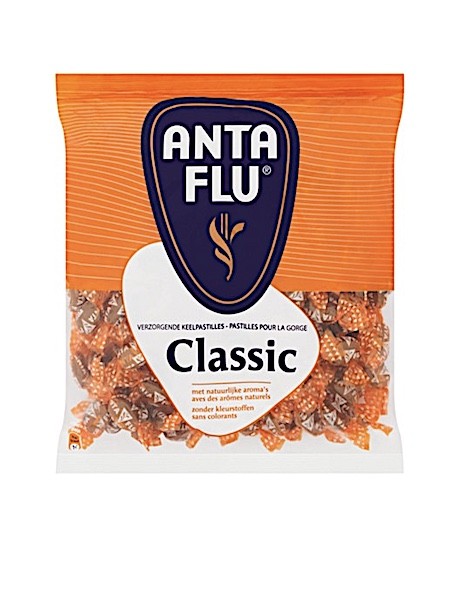 De bekendste, klassieke Anta Flu: het oranje wikkeltje is het jasje van het keelsnoepje met een dropsalmiak/mentholsmaak. Herkenbaar en erg lekker!