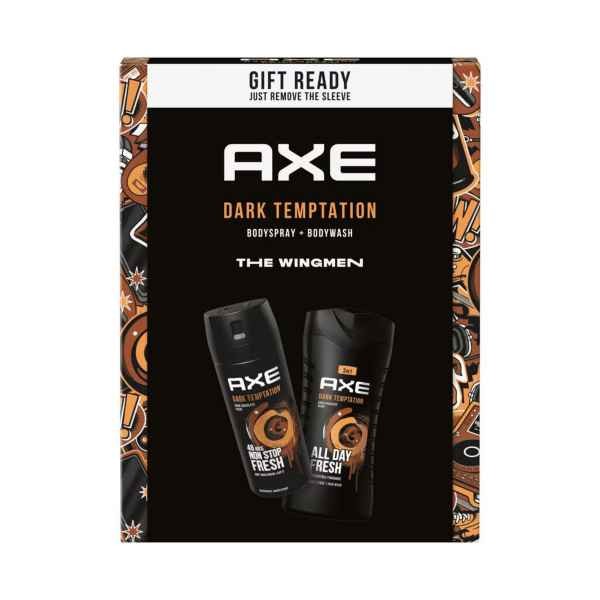 DE AXE DARK TEMPTATION DUO GESCHENKSET IS HET IDEALE CADEAU VOOR DIE SPECIALE MAN IN JE LEVEN DIE ZICHZELF GRAAG GOED VERZORGT. • Ruik onweerstaanbaar met de AXE Dark Temptation Bodyspray Deodorant en Douchegel • Een onweerstaanbare geur van chocolade met een vleugje kruiden • AXE Dark Temptation Geschenkset is het perfecte cadeau voor die speciale man in je leven • AXE Dark Temptation 3-in-1 Douchegel voor lichaam, gezicht en haar, verwijdert bacteriën en geeft tot 12 uur lang een fris gevoel • Met handige en stijlvolle toilettas voor thuis of onderweg • Leuk voor jezelf of om weg te geven.