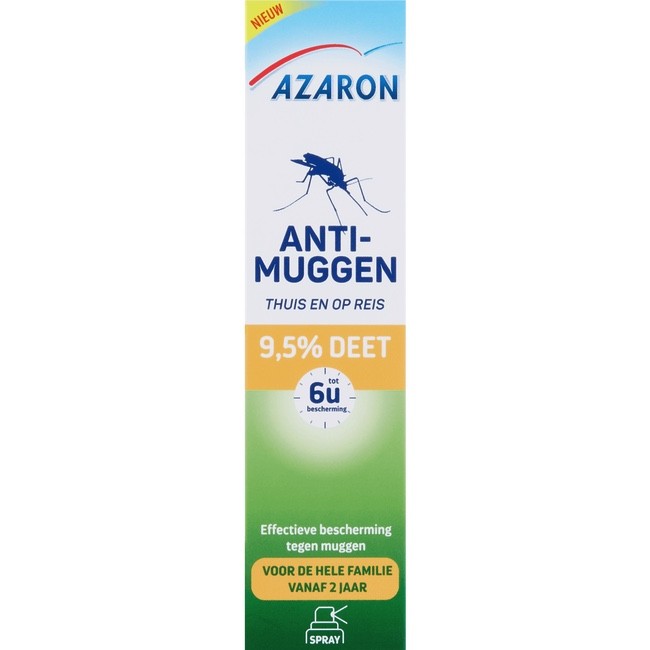 Azaron Anti-muggen 9,5% DEET Spray voor thuis en op reis biedt tot 6 uur effectieve bescherming tegen de meest voorkomende muggensoorten in Nederland. Voor sommige tropische soorten kan de werkingsduur korter zijn, gemiddeld 2 uur bescherming tegen de gelekoortsmug of denguemug (welke o.a. het Zikavirus kunnen overdragen) en 5 uur tegen de malariamug. Voor de hele familie. Vanaf 2 jaar.