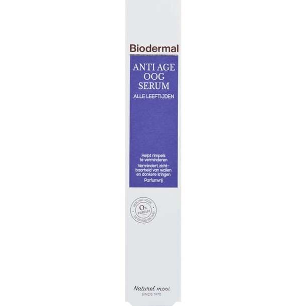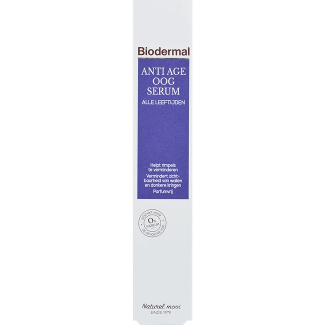 Biodermal Anti-Age Oogserum verstevigt de kwetsbare huid rondom de ogen en helpt rimpels en de zichtbaarheid van donkere kringen en wallen te verminderen. Het serum is parfumvrij en geschikt voor gebruik rondom de ogen. Voor een prachtig strak, egaal effect.