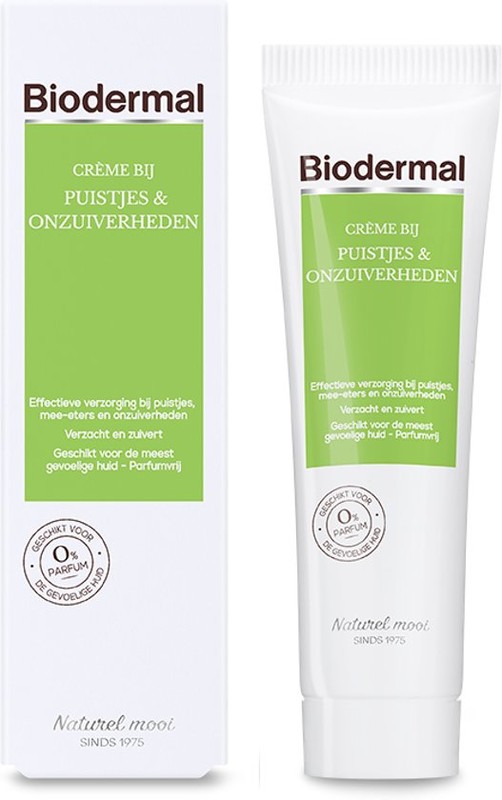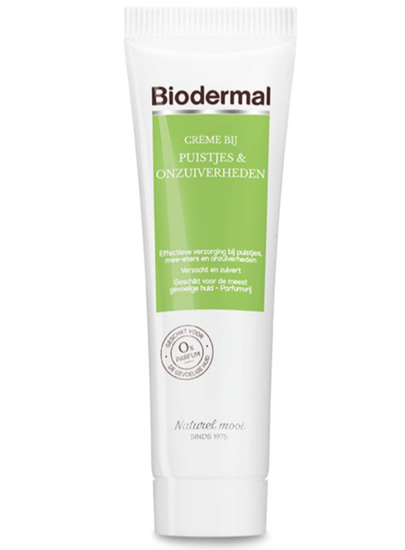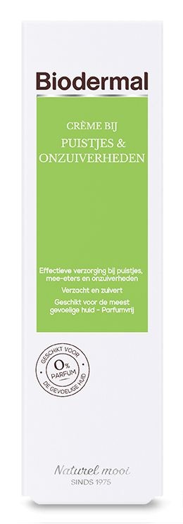 Puistjes volledig voorkomen is lastig. Vooral jeugdpuistjes gaan hand in hand met hormonale veranderingen in je lichaam en kunnen vrijwel nooit helemaal voorkomen worden. Wel kan je door een goede reiniging en door het gebruiken van de juiste huidverzorgingsproducten de ontwikkeling van een onrustige huid helpen verminderen. Biodermal Crème bij Puistjes & Onzuiverheden biedt een effectieve verzorging bij puistjes, mee-eters en onzuiverheden, zonder je huid te irriteren of uit te drogen. De milde formule is gebaseerd op een gepatenteerde samenstelling van ingrediënten. De crème verzacht je huid en herstelt de natuurlijke vochtbalans. De crème trekt snel in en droogt je huid niet uit. Geschikt voor de meest gevoelige huid.