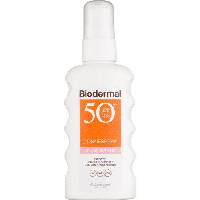 Biodermal Gevoelige Huid Zonnespray SPF 50+ 175 ml heeft een zeer hoge beschermingsfactor voor de (kinder)huid. Bevat geavanceerde en fotostabiele UVA/UVB filters voor onmiddellijke bescherming. De zonnespray is speciaal ontwikkeld voor de gevoelige (kinder)huid. De zorgvuldig geselecteerde UV filters helpen huidreacties te verminderen. Daarnaast is de zonnespray parfumvrij, geschikt voor de gevoelige huid en zeer water-/ zand resistant.