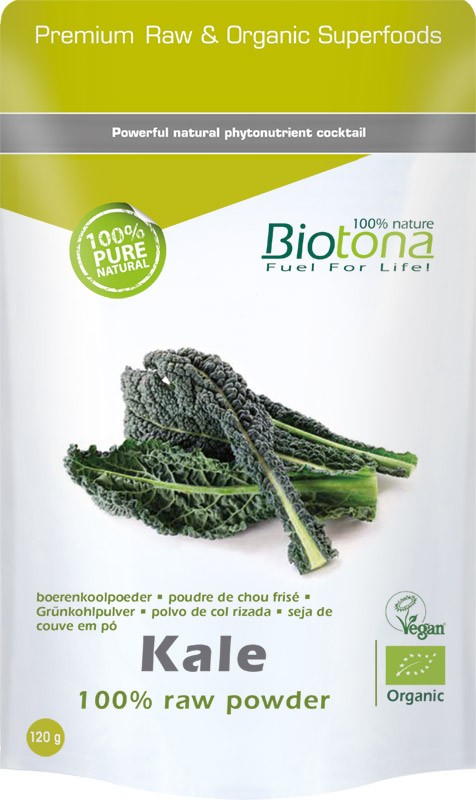 Biotona Bio Kale Raw is afkomstig van Brassica oleracea acephala of boerenkool. Deze gekrulde koolsoort wordt terecht aanschouwd als de koningin van de bladgroenten want ze bevat een arsenaal aan fytonutriënten! Kale staat dan ook terug volop in de kijker en werd ook herontdekt door de wetenschappers. De gewassen die worden gebruikt voor het Biotona poeder, worden 100% biologisch gekweekt in Polen en direct na de oogst en de selectie door middel van vriesdroging verwerkt tot een poeder, dat qua smaak, geur en kleur erg dicht aansluit bij de verse groente. Dit droogproces zorgt er ook voor dat de natuurlijk aanwezige voedingsstoffen en fytonutriënten optimaal behouden blijven!