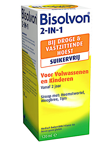 Bisolvon 2-in-1 Suikervrij met heemstwortel, weegbree en tijm. Hydrateert het slijm bij vastzittende hoest en vermindert irritatie bij droge prikkelhoest