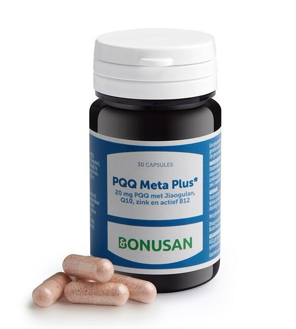 Bonusan PQQ Meta Plus combineert vijf ingrediënten die samen meer zijn dan de som der delen. Dit product bevat PQQ als MGC PQQ®, aangevuld met het zogenaamde onsterfelijkheidskruid Jiaogulan als Fermogulan™, Kaneka QH co-enzym Q10 (als ubiquinol), het mineraal zink en de biologisch actieve variant van vitamine B12 (adenosylcobalamine). Daarmee bieden we een zeer onderscheidend en kwalitatief hoogwaardig product. - PQQ is wetenschappelijk sterk onderbouwd - Het onsterfelijkheidskruid Jiaogulan draagt bij tot de normale werking van het immuunsysteem* - Complete formule met cofactor co-enzym Q10, het mineraal zink en vitamine B12