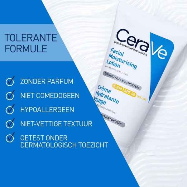 CeraVe Facial Moisturizing Lotion SPF 50 bevat 3 essentiële ceramiden om de huidbarrière te versterken, en breedspectrum zonbescherming om te helpen de huid te beschermen tegen dagelijkse UVA/UVB blootstelling in één stap. Deze dagelijkse moisturizer voor het gezicht combineert de herstellende eigenschappen van 3 essentiële ceramiden, met SPF 50 zonbescherming. Dit zorgt voor hydratatie, bescherming en het intact houden van de huidbarrière tijdens dagelijkse blootstelling aan de zon. De hydraterende crème helpt de huid beschermen tegen vervuilende deeltjes, met de hulp van MVE technologie: de lichte lotion zorgt voor een continue afgifte van hydraterende ingrediënten gedurende de dag, en zorgt voor hydratatie tot wel 24 uur. Daarnaast bevat de gezichtscreme Vitamine E en Niacinamide, om de huid gedurende de hele dag te kalmeren en hydrateren.