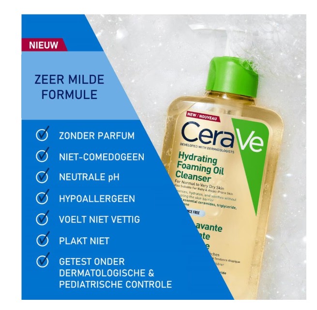 CeraVe Hydraterende Schuimende Reinigingsolie, ontwikkeld in samenwerking met dermatologen, is een unieke formule op basis van een schuimende olie die de huid zachtjes reinigt, hydrateert en kalmeert zonder de huidbarrière te verstoren.