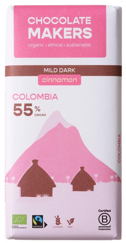 Milde pure chocolade met een snufje kaneel. De bonen komen van vrouwencoöperaties in Colombia, behorende tot de inheemse Arhuaco bevolking, die nu mede dankzij de cacao stabiele inkomsten hebben.