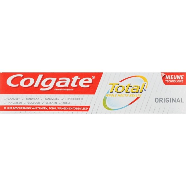 De geavanceerde formule van Colgate Total Original Tandpasta met unieke antibacteriële werking helpt om problemen zoals tandplak en tandvleesproblemen te voorkomen en werkt tot wel twaalf uur lang. De tandpasta zorgt voor een complete bescherming en een gezonde mond.