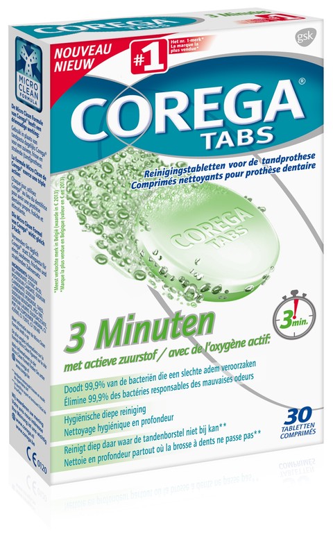 Als u op zoek bent naar een grondige reiniger maar uw kunstgebit liever niet 's nachts laat weken, dan is Corega® 3 Minuten precies wat u zoekt. In amper 3 minuten doodt het product 99,9 % van de bacteriën die een slechte adem veroorzaken*, en helpt het vlekken te verwijderen en tandplak te reduceren, wat u een schoner en frisser kunstgebit geeft, zodat u dichter kunt komen bij de mensen waar u het meeste om geeft.