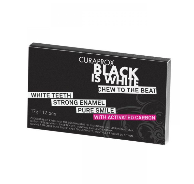 De Curaprox Black Is White Kauwgom is een zwarte whitening kauwgom en heeft koolstof als actief bestandsdeel dat verkleuringen tegen gaat zonder de tanden te beschadigen. Daarnaast biedt Natriumfluoride en natuurlijke enzymen bescherming tegen gaatjes. Tot slot beschermt hydroxylapatiet als een dunne filmlaag het tandglazuur en gaat gevoelige tanden tegen.