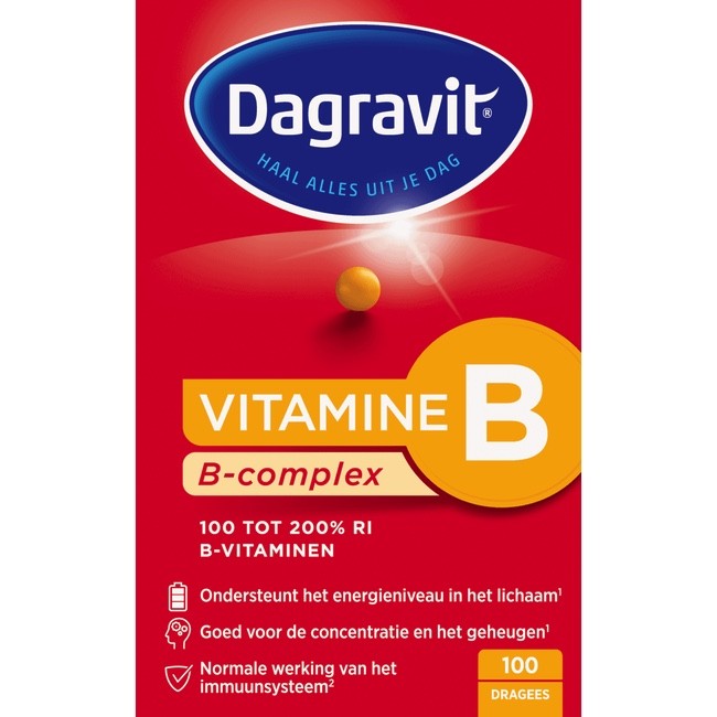 Dagravit B-Complex Dragees bevorderen de normale werking van het immuunsysteem, concentratie en geheugen. Dagravit B-Complex bevat vitamine B1, B2, B3, B5, B6 en B12 die een goede energiestofwisseling bevorderen. Vitamine B1, B3 en B6 dragen bij aan een normale werking van het geheugen en de concentratie. De aanwezige vitamine B11 heeft een gunstige werking op het immuunsysteem.