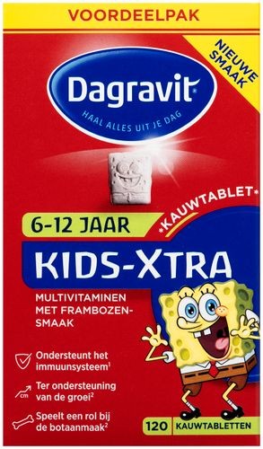 Dagravit Kids-Xtra is een voedingssupplement voor kinderen in de leeftijd van 6 tot en met 12 jaar in de vorm van kauwtabletten met frambozen smaak. Als aanvulling op je dagelijkse voeding bevat Dagravit Kids-Xtra belangrijke multivitaminen en mineralen. Kinderen zijn namelijk volop in beweging. Ze groeien hard, zijn druk op school en spelen veel. Vitaminen en mineralen zijn belangrijk ter ondersteuning van de groei, weerstand en het energieniveau. Gezond en gevarieerd eten is daarbij essentieel en Dagravit zorgt elke dag voor een optimale aanvulling.