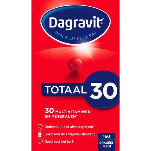 Dagravit Totaal 30 Dragees 150 stuks bevatten belangrijke vitaminen en mineralen die de afweer van het lichaam ondersteunen. Daarnaast zijn deze dragees goed ter ondersteuning van de energiehuishouding en hebben ze een gunstige werking op het hart. Vitamine A, C en selenium ondersteunen het afweersysteem. De aanwezige B-vitaminen, ijzer en koper dragen bij aan een goede energiehuishouding. De dragees zijn rijk aan vitamine B1 wat bijdraagt tot de normale werking van het hart.