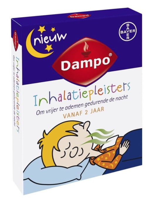 Toepassing: Direct op de kleding, bijvoorbeeld op de pyjama, op borsthoogte aanbrengen. De etherische oliën komen gedurende ongeveer acht uur vrij, helpen om vrijer adem te halen gedurende de nacht en bevorderen daardoor de nachtrust. Dampo Inhalatiepleisters kunnen ook overdag worden gebruikt. Gebruiksaanwijzing:. 1. Open het zakje. 2. Verwijder het beschermende laagje. 3. Bevestig de Dampo Inhalatiepleister op de kleding op borsthoogte. De kleding waarop de Dampo Inhalatie wordt aangebracht moet droog zijn. Dampo Inhalatiepleisters bevatten Bitrex®. Dit is een bittere stof die voorkomt dat kinderen de Inhalatiepleisters per ongeluk in hun mond stoppen en willen opeten. De Inhalatiepleister is gemakkelijk te bevestigen en te verwijderen. Op een koele en droge plaats bewaren, uit de buurt van warmtebronnen. Toepassing: Direct op de kleding, bijvoorbeeld op de pyjama, op borsthoogte aanbrengen. De etherische oliën komen gedurende ongeveer acht uur vrij, helpen om vrijer adem te halen ge
