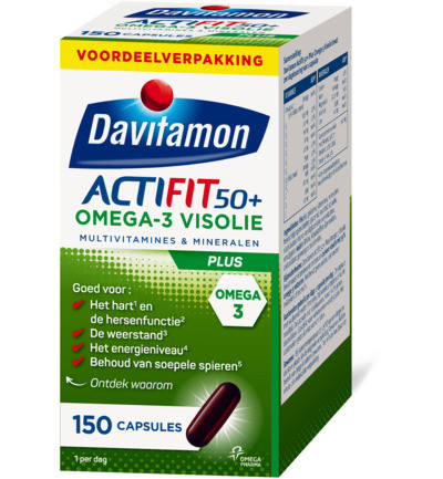 Davitamon Actifit 50+ Omega-3 Visolie Capsules 150 stuks zijn speciaal ontwikkeld voor volwassenen vanaf 50 jaar. Davitamin Actifit 50+ plus Omega-3 Visolie combineert vitamines, mineralen en zuivere visolie met 55% omega-3 vetzuren in één capsule. De samenstelling is afgestemd op de behoefte van volwassenen vanaf 50 jaar. Deze capsule voorziet in de dagelijkse aanvulling van vitamines en mineralen. De zuivere visolie met 55% omega-3 vetzuren is speciaal toegevoegd om het hart te ondersteunen. Davitamon Actifit 50+ plus Omega-3 Visolie helpt een actief en vitaal leven te behouden.
