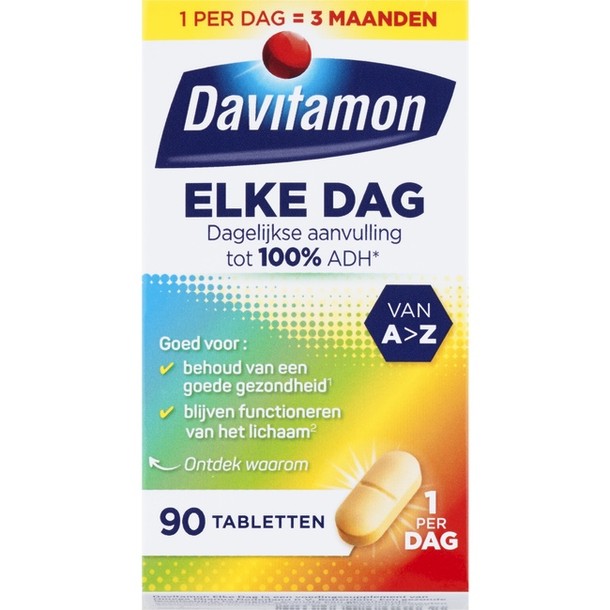 Davitamon Elke Dag Tabletten helpen je om het hele jaar een goede gezondheid in stand te houden. Het is een complete multivitaminen met 22 essentiële vitamines en mineralen die samen tot 100% van de aanbevolen dagelijkse hoeveelheid bevatten. Davitamon Elke dag Tabletten dragen bij aan het behoud van een goede gezondheid en het blijven functioneren van het lichaam. Davitamon Elke Dag is geschikt voor volwassenen, zowel mannen als vrouwen.