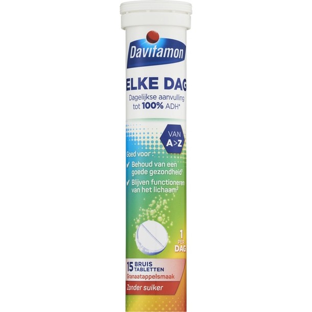 Davitamon Elke Dag Bruistabletten Granaatappelsmaak zijn speciaal ontwikkeld voor volwassenen als aanvulling van vitamines en mineralen op dagelijkse voeding. Deze bruistabletten hebben een heerlijke granaatappelsmaak. Davitamon Elke Dag is een complete multivitaminen met 22 essentiële vitamines en mineralen. Het bevat een combinatie van vitamines en mineralen die onder andere bijdragen aan een goede weerstand (vitamine C en D en selenium en zink).