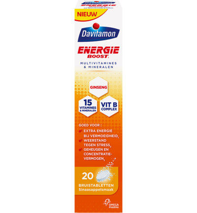 In sommige situaties, zoals bij vermoeidheid, in drukke perioden of bij lusteloze gevoelens, kan het lichaam een verhoogde behoefte aan energie hebben. Davitamon Energie Boost; combineert alle dagelijks belangrijke vitamines en de mineralen koper, ijzer en zink met ginsengextract in één bruistablet. Vitamine B2, B3, B6, B12, ijzer en ginseng geven je extra energie bij vermoeidheid. Zink en vitamine B11 helpen bij de weerstand tegen stress en vitamine B1, B3, B8, B11 en B12 hebben een positieve invloed op het geheugen en concentratievermogen.