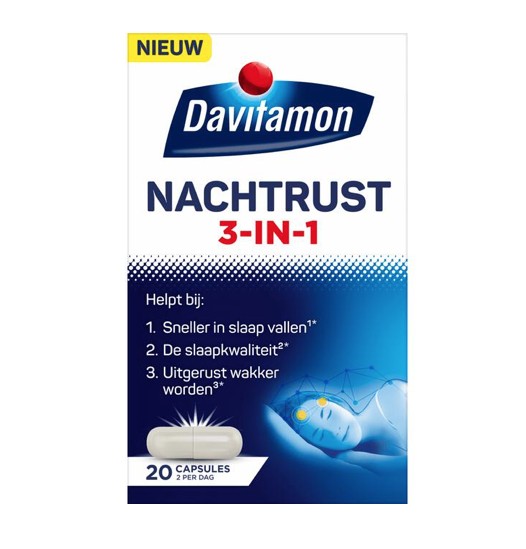 Davitamon Nachtrust 3-in-1 ondersteunt in 3 verschillende aspecten van het behoud van een goede nachtrust: het helpt om sneller in slaap te vallen, is goed voor de slaapkwaliteit en helpt om uitgerust wakker te worden. De formule bevat hiervoor een combinatie van natuurlijke extracten van valeriaan, passiebloem, slaapmutsje, hop en melisse.
