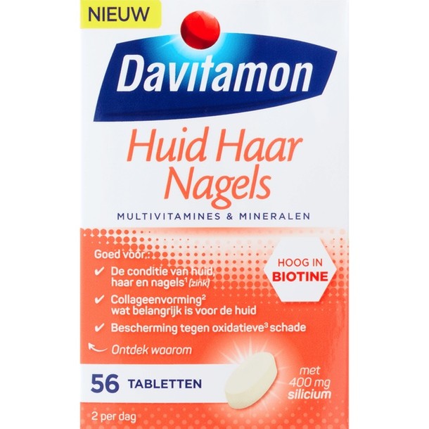 Davitamon Huid Haar Nagels Tabletten ondersteunen gezond haar, een stralende huid en mooie, sterke nagels.