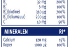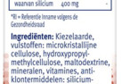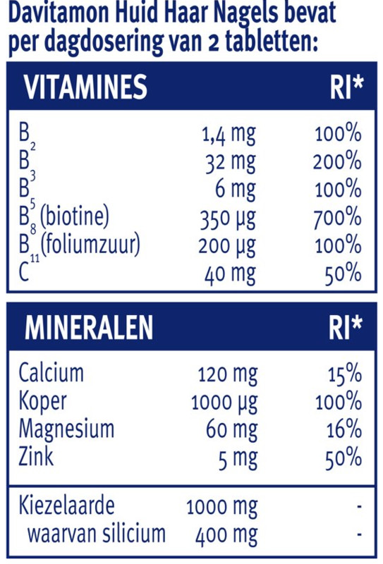 Per dagdosering van 2 tabletten:#vitamine B2;1,4;mg;100%#vitamine B3;32;mg;200%#vitamine B5;6;mg;100%#vitamine B8 (biotine);350;µg;700%#vitamine B11 (foliumzuur);200;µg;100%#vitamine C;40;mg;50%#calcium;120;mg;15%#koper;1000;µg;100%#magnesium;60;mg;16%#zink;5;mg;50%#kiezelaarde;100;mg;waarvan silicium;400;mg# % gebaseerd op de RI