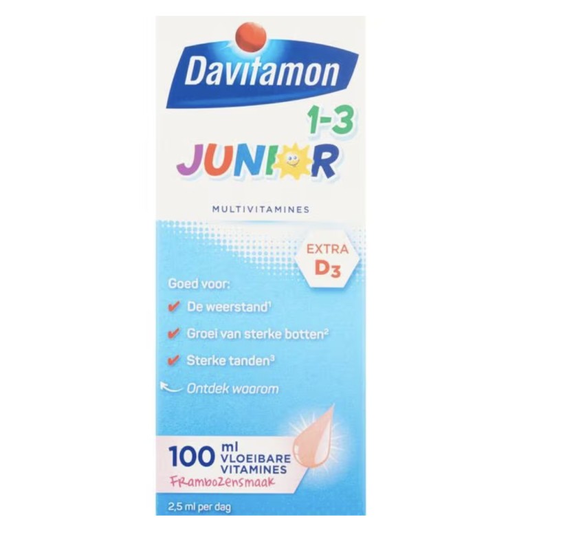 Davitamon Junior 1+ vloeibare vitamines is speciaal voor kinderen die nog moeten leren kauwen, afgestemd op de specifieke behoeften van kinderen vanaf 1 jaar volgens het advies van de Gezondheidsraad. Bevat 10 mcg vitamine D per dagdosering, waardoor extra aanvulling naast deze multivitamine niet noodzakelijk is.