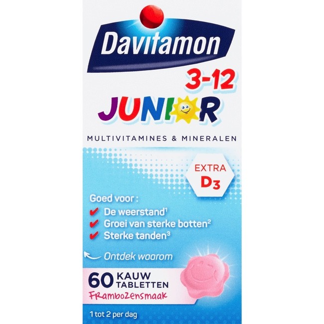 Davitamon Junior 3+ kauwvitamines is afgestemd op de behoeftes van kinderen vanaf 3 jaar. Voor een goede weerstand en sterke botten en tanden. In de smaken multifruit, framboos en banaan.
