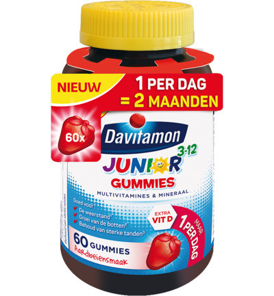 Davitamon Junior 3-12 Gummies Aardbeiensmaak zijn multivitaminen met vitaminen en mineralen afgestemd op de specifieke behoeften van kinderen van 3 tot 12 jaar. Omdat groeien niet vanzelf gaat, is het belangrijk dat kinderen voldoende vitamines en mineralen binnen krijgen. Davitamon Junior 3-12 Gummies, met extra vitamine D, hebben een lekkere aardbeiensmaak. Davitamon Junior 3-12 Gummies dragen bij aan een goede weerstand, de groei van botten en het behoud van sterke tanden.