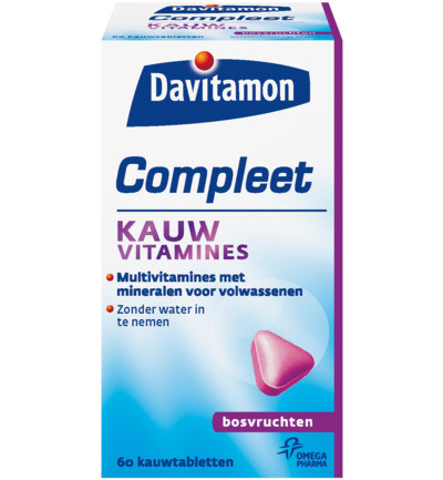 Davitamon Compleet Kauwvitamines bevat als aanvulling op de voeding de vitamines en mineralen die nodig zijn. Zorgt voor extra energie en goede weerstand.
