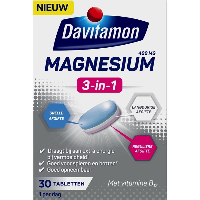 Davitamon Magnesium 3-in-1 bevat de unieke Triple Layer technologie, die ervoor zorgt dat magnesium in drie verschillende fasen aan het lichaam wordt afgegeven. Magnesium speelt een essentiële rol bij verschillende lichaamsfuncties. Het is onder andere belangrijk voor de energiestofwisseling, speelt een rol bij het behoud van sterke spieren en botten, draagt bij tot vermindering van vermoeidheid en is goed voor het concentratievermogen. De tabletten dragen bij aan normaal psychologisch functioneren.