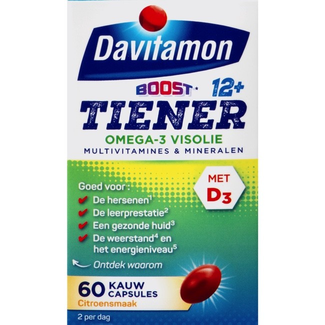 Davitamon Multi Boost Junior 12+ Omega-3 Visolie Kauwcapsules Citrus zijn voedingssupplementen met omega 3 vetzuur. Deze kauwcapsule bevat een combinatie van vitamines, mineralen en zuivere visolie met omega-3 vetzuren. Jongeren zijn volop in ontwikkeling en hebben daarom een andere vitamine- en mineralenbehoefte dan volwassenen. Naast voldoende vitamines en mineralen is het ook belangrijk om voldoende omega-3 vetzuren binnen te krijgen en een voedingssupplement kan hieraan bijdragen. Davitamon Multi Boost Junior 12+ Omega-3 Visolie Kauwcapsules hebben een positieve invloed op een goede weerstand, het energieniveau en ondersteunen een gezonde huid.