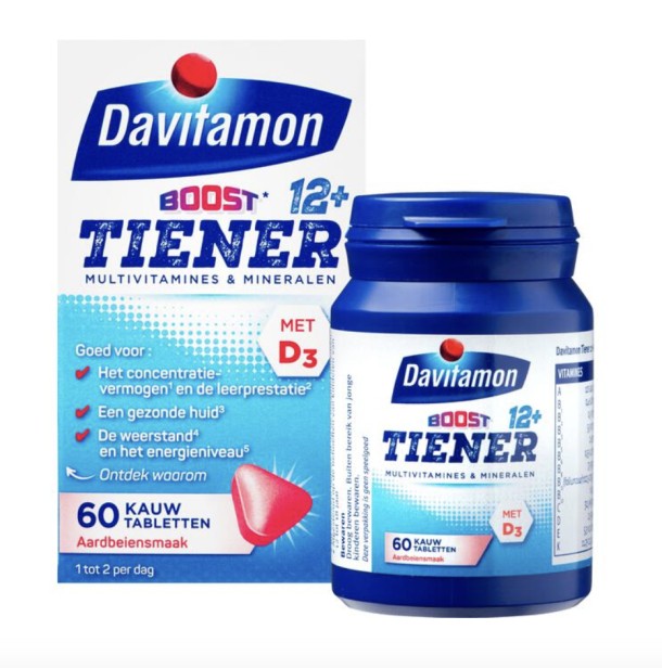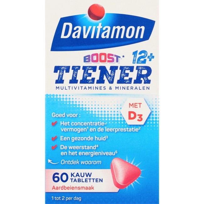 Davitamon Multi Boost 12+ Kauwvitamines Aardbei zijn ontwikkeld voor jongeren vanaf 12 jaar. Jongeren zijn volop in ontwikkeling en het is van belang dat ze vitamines en mineralen binnen krijgen en een voedingssupplement kan hieraan bijdragen. Het unieke van dit product is onder andere dat het geen suiker en conserveermiddelen bevat en een heerlijke aardbeiensmaak heeft. Vitamine B1, B3, B6, B8, B11, B12, C en zink is hebben een positieve invloed op het geheugen en concentratievermogen. Vitamine B1, B6, B11, B12, C en zink, mangaan en ijzer dragen bij aan een goede leerprestatie. Vitamine A draagt onder andere bij aan het behoud van een goede weerstand.