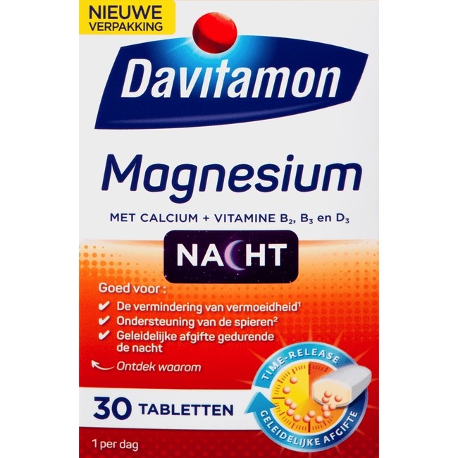 Het bijzondere aan Davitamon voor de nacht is het geleidelijk vrijkomen van de vitamines en mineralen. Neem 's avonds voor het slapen gaan in. Zo krijg je lichaam tijdens het slapen de beschikking over magnesium, calcium, vitamine B2, B3 en D.