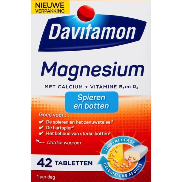 Davitamon Magnesium Met Calcium + Vitamine D Tabletten zijn ontwikkeld voor mensen die actief en vitaal willen blijven. Dit voedingssupplement bevat, naast magnesium, een combinatie van vitamines en mineralen die vaak samenwerken in het lichaam. Davitamon Magnesium Met Calcium + Vitamine D Tabletten geven geleidelijk vitamines en mineralen af gedurende de dag. Deze tabletten hebben een positieve werking op de spieren, het zenuwstelsel en het behoud van sterken botten.