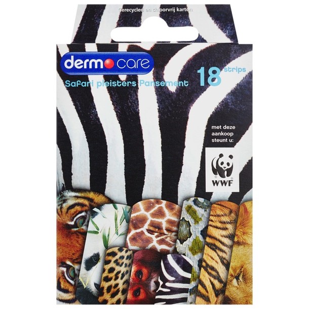 De Dermo Care WNF Pleisterstrips zijn door Dermo Care gemaakt in samenwerking met het Wereld Natuur Fonds. De pleisters zijnluchtdoorlatend, waterbestendig, vuilwerend, hechten niet aan de wond, huidvriendelijk en pijnloos te verwijderen. Er staan opdrukken op van allerlei wilde dieren, maar nog veel belangrijker is dat een deel van de verkoop van deze pleisters naar het Wereld Natuur Fonds gaat. De Dermo Care WNF Pleisterstrips zijn vrolijk bedrukt en troosten de kids extra snel.