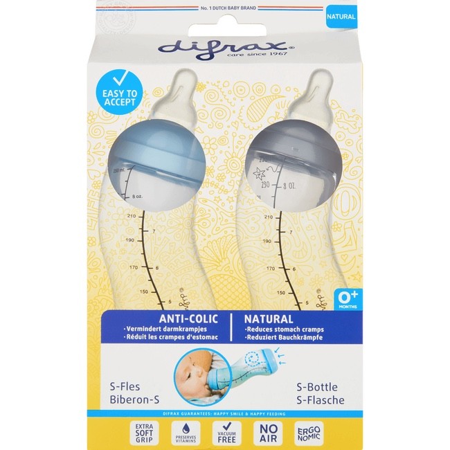 Difrax S-Fles Duopack 250 ML 0+ Maanden is de populairste babyfles voor baby, papa en mama. Het speciale anti-darmkrampjes ventiel en de S-vorm zorgen voor een constante stroom van flesvoeding. De S-fles Anti-colic is vanaf de geboorte te gebruiken en ideaal in combinatie met borstvoeding.