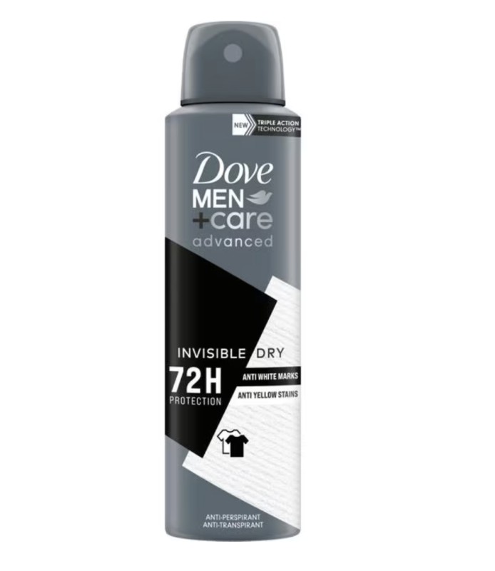 Zoek je een deodorant voor mannen die je langdurig fris houdt én je kleding beschermt tegen witte strepen en gele vlekken? De Dove Men+Care Advanced Invisible Dry Anti-Transpirant Deodorant Spray met Triple Action Technologie beschermt tot 72 uur tegen zweet, geur en irritatie en is ontworpen om gele vlekken en witte strepen op je kleding te voorkomen. Want het dragen van je favoriete kleding kan je het zelfvertrouwen geven om elke dag aan te kunnen. Daarom heb je een deodorant nodig die je kleding niet geel maakt of witte strepen achterlaat. Warm weer en zweet zijn geen partij voor deze anti-transpirant spray. Dove Men+Care Advanced Invisible Dry Anti-Transpirant Deodorant Spray helpt je je op je best te voelen. Deze niet-vlekkende anti-transpirant spray is verrijkt met 1/4 hydraterende crème om je huid te verzorgen en zorgt voor gladde en gezond aanvoelende oksels. Irritatie veroorzaakt door zweten behoort tot het verleden.