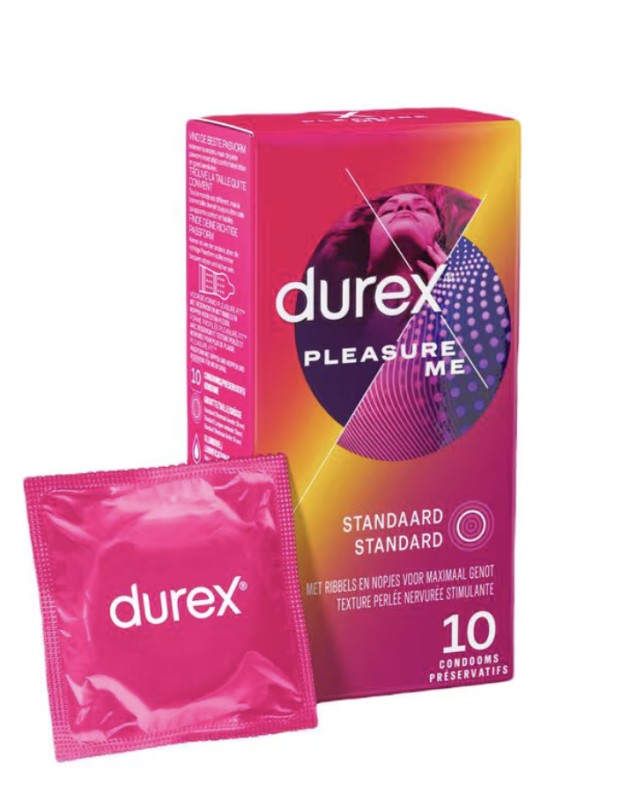 DE DUREX PLEASURE ME-CONDOOMS ZIJN ONTWIKKELD VOOR HAAR GENOT EN ZIJN DAAROM VOORZIEN VAN RIBBELS EN NOPPEN VOOR MAXIMAAL GENOT. VEILIGHEIDSVOORSCHRIFTEN: Lees de gebruiksaanwijzing aan de binnenkant van de verpakking aandachtig door, vooral bij gebruik van het condoom voor anale of orale seks. Geen enkel voorbehoedsmiddel biedt u een 100% betrouwbare bescherming tegen zwangerschap, hiv (aids) of andere seksueel overdraagbare aandoeningen. Condooms kunnen verstikkingsgevaar opleveren. Buiten bereik van kinderen bewaren