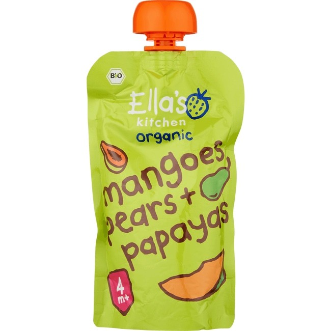 Ella's Kitchen Mangoes, Pears & Papayas 4+ Maanden is een perfect hapje voor je kindje. De 100% mix van biologische gepureerde mango’s, peren en papaya is geschikt voor baby’s vanaf vier maanden. De verantwoorde hapjes in makkelijk hersluitbare verpakking zijn ideaal voor onderweg!