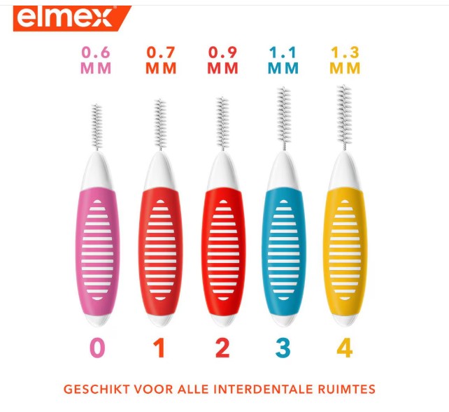 Elke verpakking bevat 8 elmex interdentale ragers in maat 1 (0,7 mm). De maten 0, 1 & 2 zijn gemaakt voor kleine interdentale ruimtes. De maten 3, 4 & 5 zijn gemaakt voor middelgrote interdentale ruimtes.
