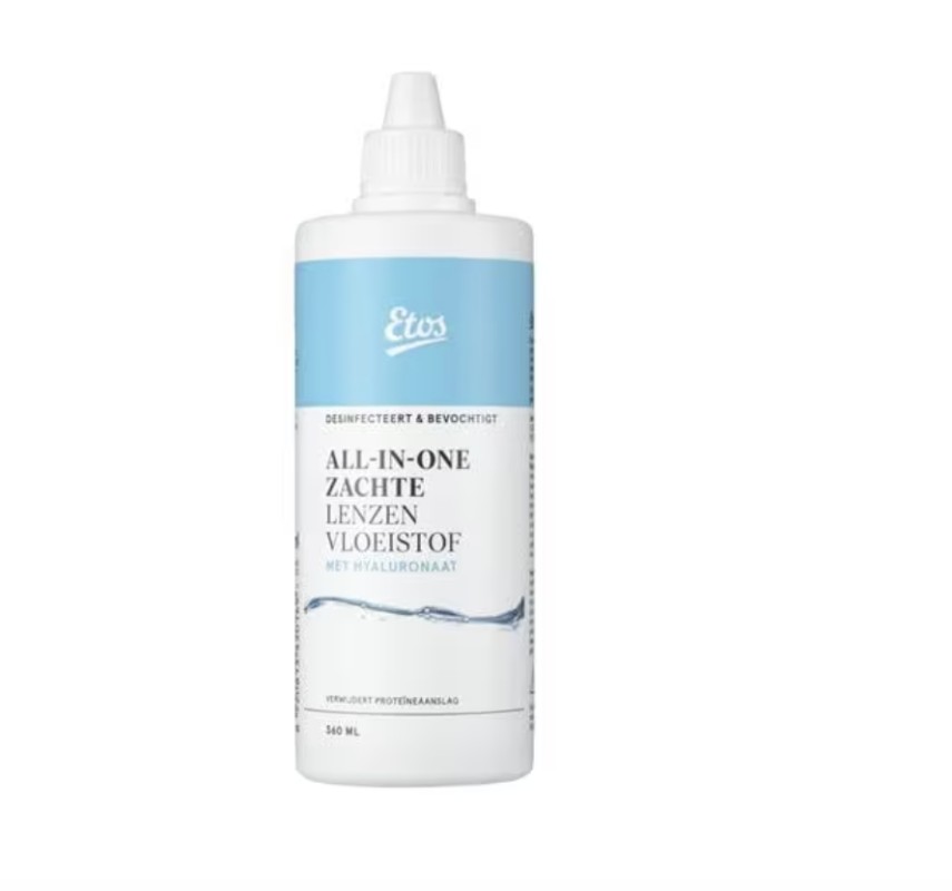 Etos All-in-one zachte lenzen vloeistof met hyaluronaat is geschikt voor gevoelige ogen en speciaal ontwikkeld voor zachte contactlenzen. De unieke formule reinigt, desinfecteert en bevochtigt de ogen en verwijdert proteïneaanslag. Met Etos all-in-one vloeistof onderhoud je zorgvuldig je lenzen.