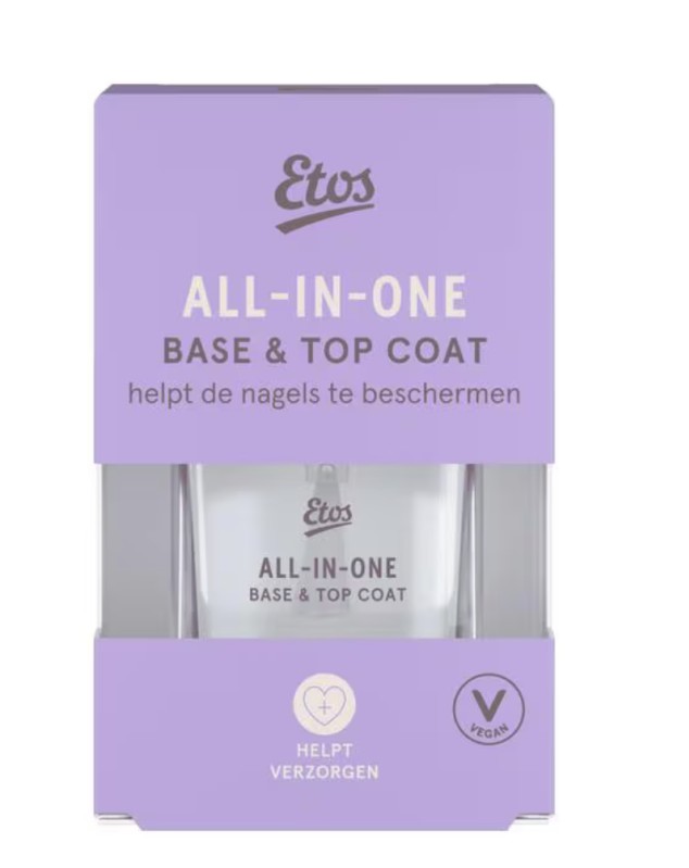 Geef je nagels een schitterende uitstraling met de Etos Base & Top Coat All-In-One. Deze veelzijdige basis- en topcoat biedt je nagels een langdurige bescherming én een prachtige glans. Gebruik het als basecoat om verkleuring te voorkomen en de hechting van je nagellak te verbeteren. Als topcoat beschermt het je nagellak, waardoor je manicure langer meegaat én blijft stralen.